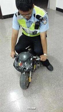 Mr. Fang of China’s southeast Zhejiang province recently bought a 60cm-high second-hand mini motorcycle with ten yuan from his friend. On the evening of July 21, Fang rode the motor on road after drinking.He was soon caught by the police. ”He looked as if he were squatting on the road while moving fast,” said the police.