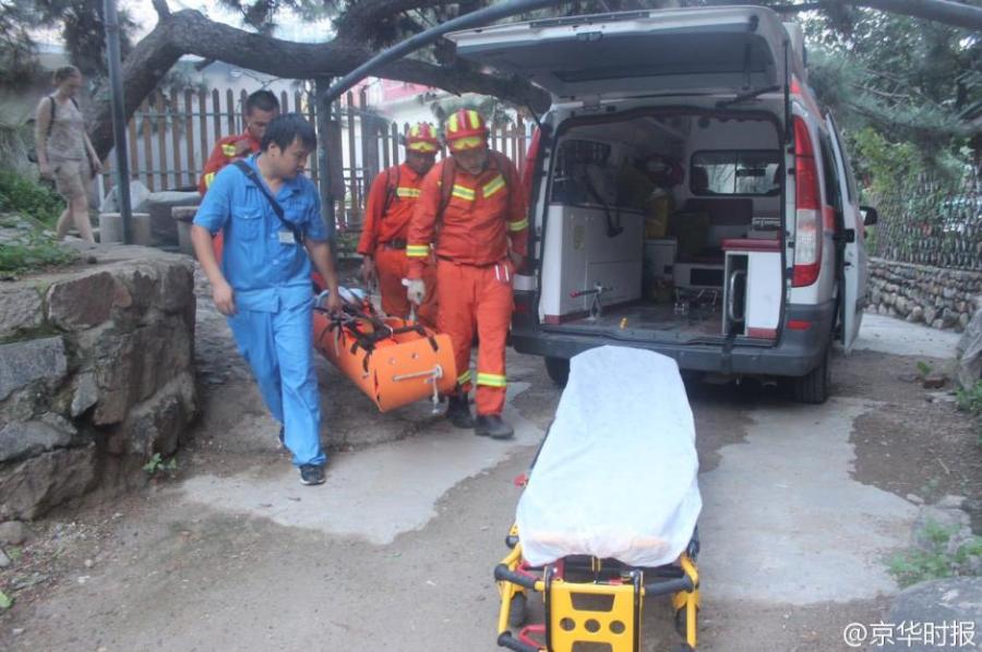 Rescuers help a South Korean tourist, injured after falling from an old, five-meter-tall watchtower on a hill in Huairou district, Beijing, July 29, 2015. Three Poland visitors found the injured woman and helped contact police for help. The South Korean tourist suffered fractures in her left arm. (Photo/Weibo of Beijing Times)