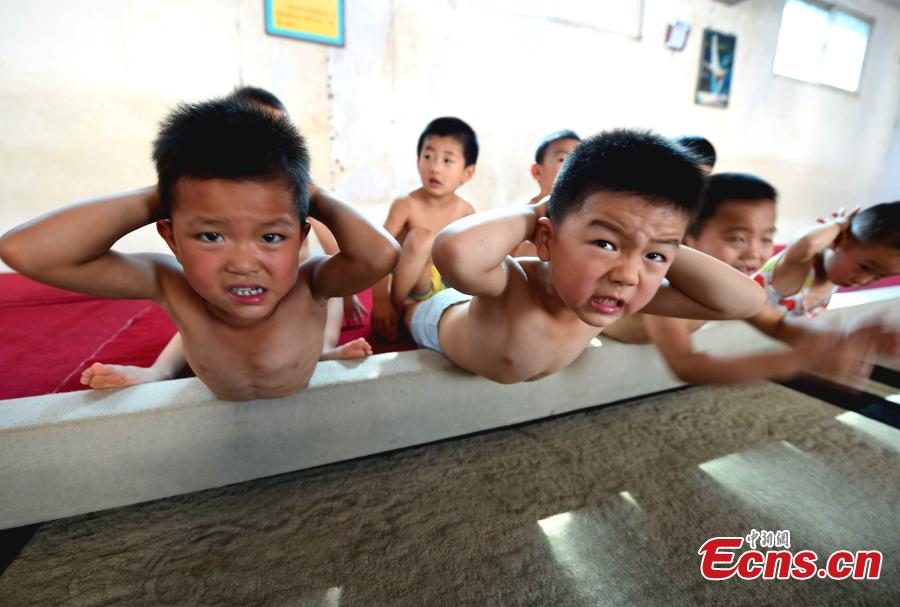 Children take part in intensive training at a gymnastics training center in Bozhou, East China's Anhui province, July 28, 2015. (Photo: China News Service/Liu Qinli)