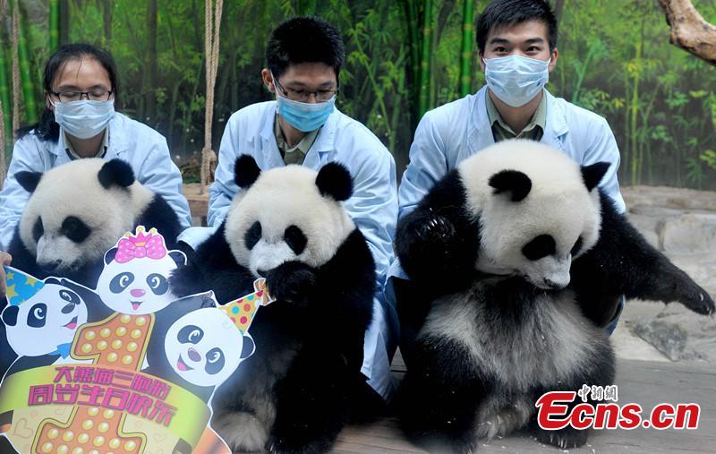 Guangzhou Chimelong Safari Park held a party to celebrate the first birthday of the world's only alive panda triplets in Guangzhou, capital of Guangdong province, July 29, 2015. (CNS photo/Liu Weiyong)