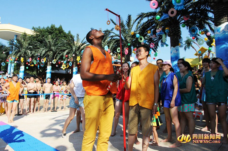 Participants from five countries including Ukraine, the Netherlands play Running Man games in Happy Valley, a large integrated amusement park In Chengdu, Sichuan province on July 25, 2015. Running Man is one of the most popular game variety shows in China. (Photo/ newssc.org)