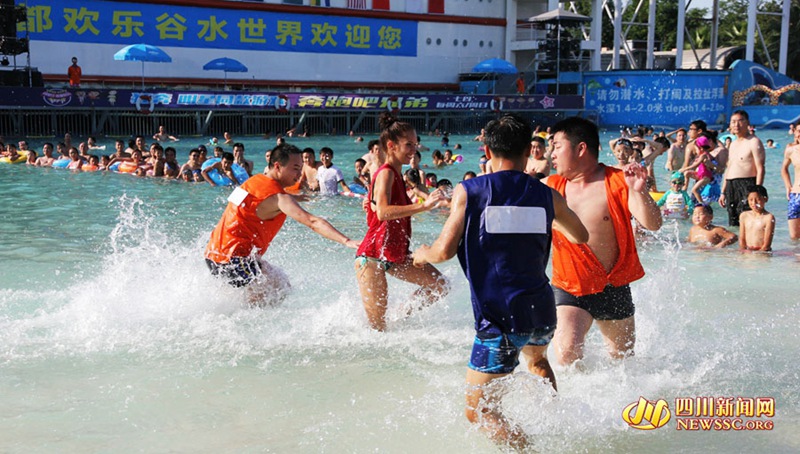 Participants from five countries including Ukraine, the Netherlands play Running Man games in Happy Valley, a large integrated amusement park In Chengdu, Sichuan province on July 25, 2015. Running Man is one of the most popular game variety shows in China. (Photo/ newssc.org)