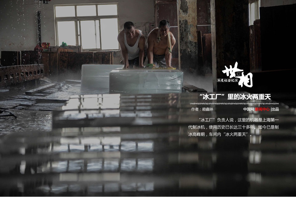 The ice-making workshop on Jungong Road is a major ice provider for Shanghai. In order to guarantee the freshness of vegetables and seafood, this workshop produces over 300 tons of ice everyday.