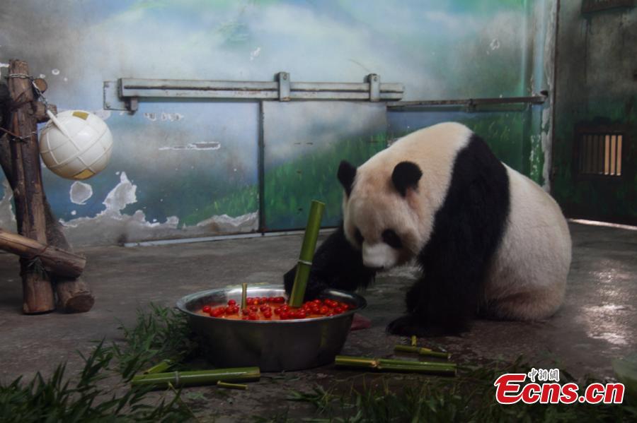Giant panda Zhen Xiao eats a specially made birthday cake at a zoo in Wuxi city, East China’s Jiangsu province, July 30, 2015. The three-layer cake is made of mixed fruits. Zhen Xiao turns nine years old on August 6 and has lived at the zoo for five years. (Photo: China News Service/Sun Quan)