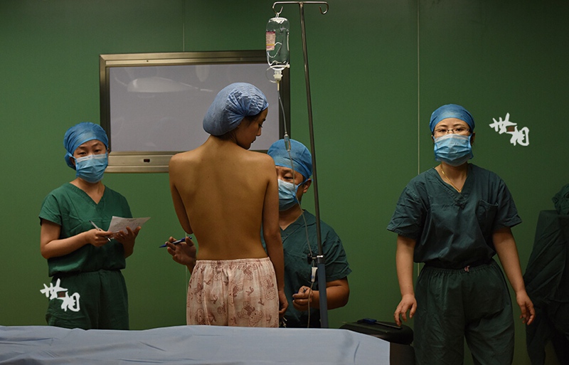 Surgeon draws lines on Wang Qi’s breasts before surgery. (China.com.cn/ Jiang Yu)