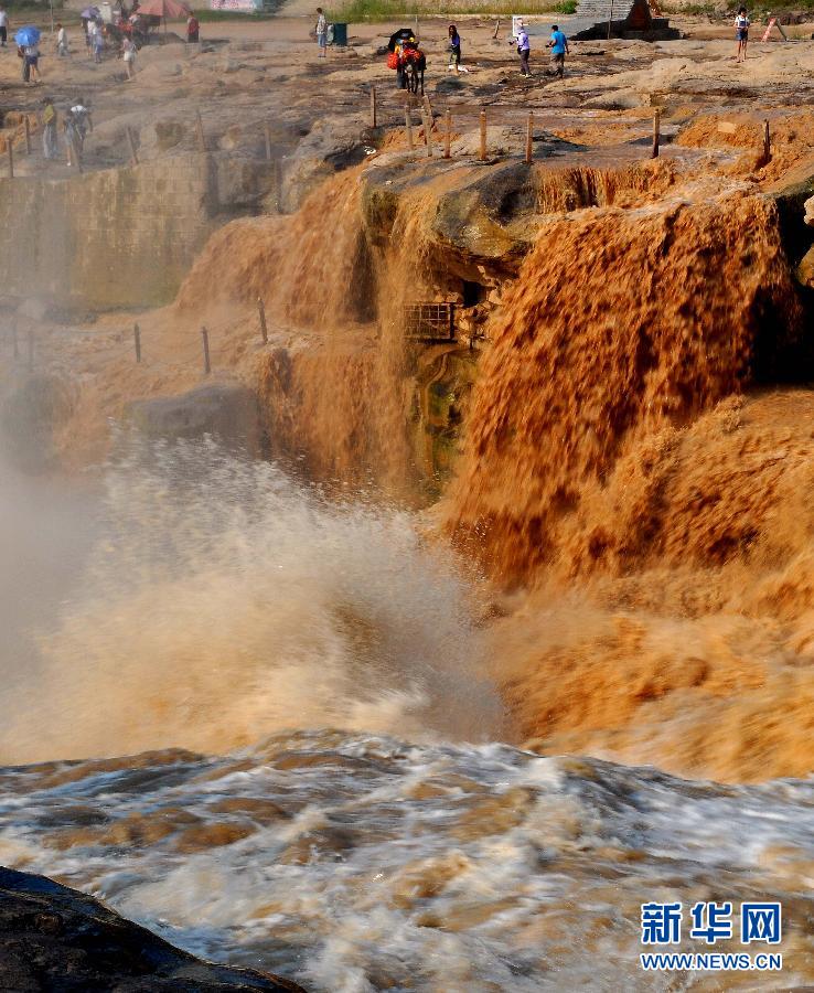 Tourists enjoy the marvelous spectacle of Hukou Waterfall of the Yellow River on July 30, 2015. Affected by the heavy rain of Yunyan River in Shaanxi province, Hukou Waterfall shows marvelous spectacle of half clear and half turbid, which has attracted many tourists. (Photo by Xinhua News Agency/Lyu Guiming)