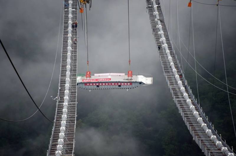 Construction work on a suspension bridge over Longjiang River in China’s Yunnan Province has just started, as workers installed the bridge’s first box girder on Thursday.