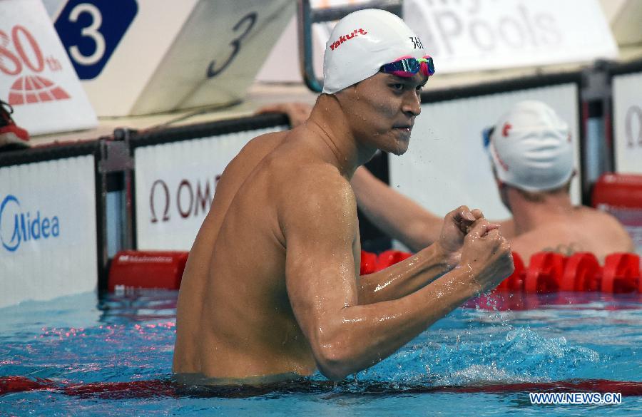 Sun Yang of China celebrates after winning the men's 400m freestyle swimming final at FINA World Championships in Kazan, Russia, Aug. 2, 2015. Sun Yang claimed the title of the event in a time of 3 minutes and 42.58 seconds. (Xinhua/Pavel Bednyakov)
