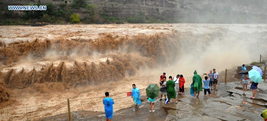 | Tourists visit the Hukou Waterfall of the Yellow River in Jixian County, north China's Shanxi Province, Aug. 2, 2015. (Xinhua/Lyv Guiming) |