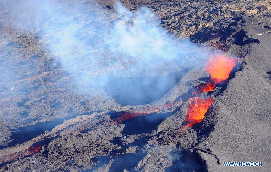Photo taken on Aug. 1, 2015 shows the erupted Furnace Volcano in French overseas island La Reunion. The volcano is currently one of the most active volcanoes in the world. (Xinhua/Zhang Chuanshi)