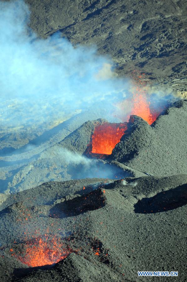 Photo taken on Aug. 1, 2015 shows the erupted Furnace Volcano in French overseas island La Reunion. The volcano is currently one of the most active volcanoes in the world. (Xinhua/Zhang Chuanshi)