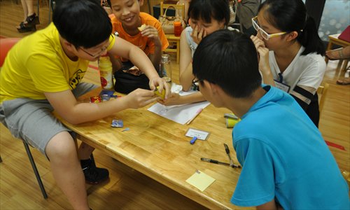 Children who participated in the summer camp learn how to use a condom by putting one on a banana. Photo: Zhang Yiqian/GT