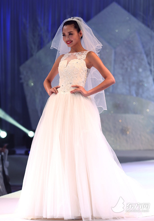 Sixteen Chinese contestants for 2015 Miss Universe 2015 pageant present bridal dresses for a high-end custom wedding show held in Shanghai Shangri-La Hotel on Aug. 3, 2015. (Photo/ eastday.com)