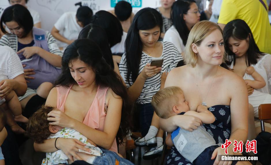 Eighty-eight mothers from China and all over the world stage a flash mob in Jinmao Tower in Shanghai, calling for public support for breastfeeding on Aug. 1, 2015. (CNS/Tang Junyi)