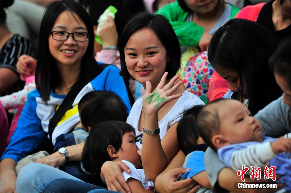 A flash mob of breastfeeding is staged in Xisi Square in Kunming, capital of southwest China's Yunnan province to call for public support for breastfeeding on Aug. 1, 2015. (CNS/Liu Ranyang)
