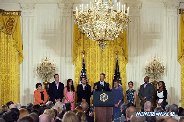 | U.S. President Barack Obama speaks about Clean Power Plan at the East Room of the White House in Washington D.C., the United States, Aug. 3, 2015. President Barack Obama announced on Monday a tougher climate change plan for power plants amidst an overwhelming opposition from U.S. states nationwide. (Xinhua/Yin Bogu) |