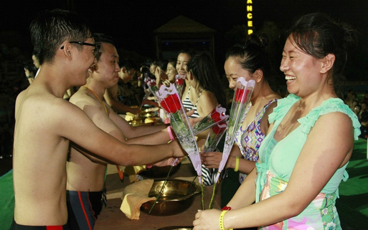 Games also include guys performing squats holding a girl in their arms, water gun squirting and handing out roses. (Photo/ zjol.com.cn)