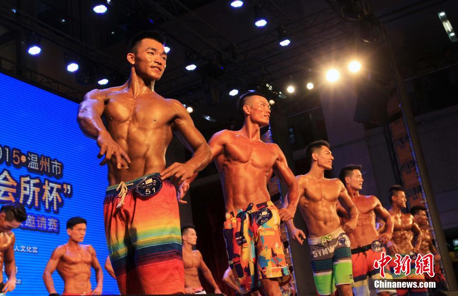 Muscle men show their strong and handsome figures in Wenzhou Worker’s Culture Hall, Zhejiang province on Aug. 2, 2015.