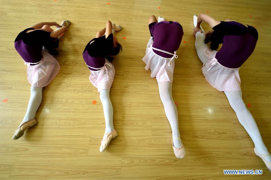 Children practice basic skills in a dance class in Hongning Dancing School in Bozhou, east China's Anhui Province, Aug. 4, 2015. Many children here chose to take dancing class to spend their summer vacation. (Xinhua/Liu Qinli)