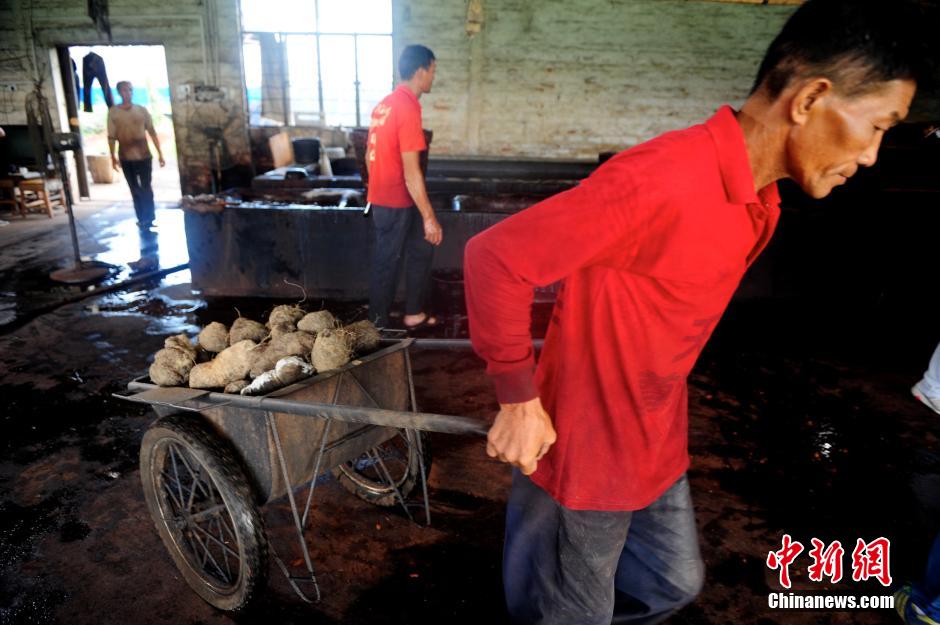 Workers work on the dye material - cirrhosa. (Photo/CNS)