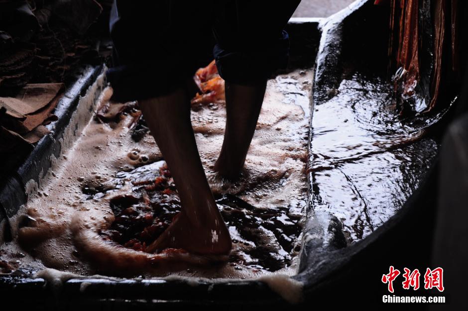 Workers work on the dye material. (Photo/CNS)