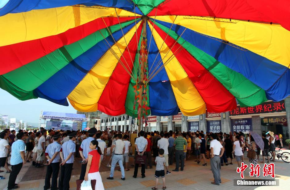 On August 3rd, a gigantic sun-and-rain-proof umbrella exhibited on Qinde Cultural Square in Xingzi County, Jiangxi Province. The umbrella, which is designed to fold and unfold automatically, can resist 9-grade wind and cover an area of 418 square meters, with a height of 18 meters, diameter of 23 meters and weight of 5.7 tons. It takes 14 minutes for the umbrella to unfold thoroughly. A local umbrella enterprise spent 700 thousand yuan and half a year in producing the umbrella, which has set a Guinness World Record. It obtained the certificate for Guinness World Record and became the biggest sun-and-rain-proof umbrella in the world by far.
