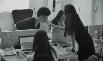 Screenshot from surveillance camera shows a young woman feds a man a corn cob while at work. (File photo/xyzd.cn)