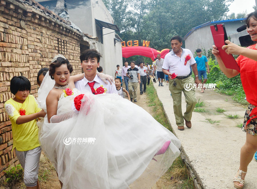 | Cycling enthusiast Liu Zhaohui, accompanied by over 60 friends from his cycling club, rides 26 km to fetch his bride Zhang Ningning in Liaocheng, east China’s Shandong province on Aug. 3, 2015. The couple got acquainted in the cycling club, and they chose to have a “low carbon wedding” through riding. (Photo/iqilu.com) |