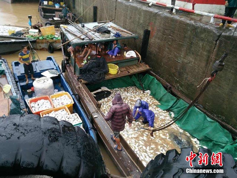 3,426 tons of gold pomfrets die in a heavy storm which lasted for several days in Qinzhou, southwest China's Guangxi, which has causes a direct economic loss of 75 million yuan. Currently, the dead fishes have basically been salvaged, and the disaster relief work by local government is underway. (CNS/Li Qiteng)