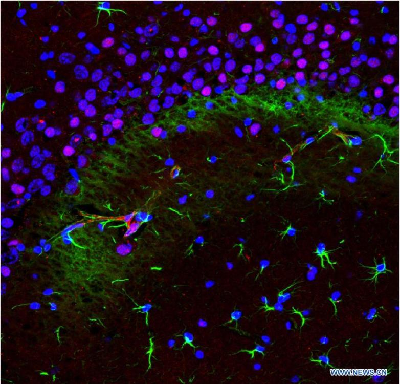 | Photo provided by Xinqiao Hospital of Third Military Medical University in southwest China's Chongqing on Aug. 5, 2015 shows Hippocampal microglia cells magnified 1,000 times viewed under a microscope. The university took a series of photos of organs and tissues of human body in microscopic level by using techniques like nuclear magnetic resonance (NMR), color ultrasonography and confocal laser scanning microscopy. Such techniques and photos will provide an insight for observing life process and guide accurate surgeries for medical staff. (Photo/Xinhua) |