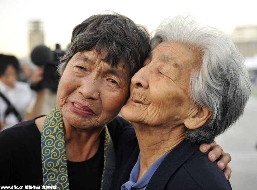 At the atomic bomb explosion site, 92-year-old survivor Tsuyuko Nakao hugs the 77-year-old survivor Kinuyo Ikegami, Aug. 6, 2010. (Photo/DFIC)