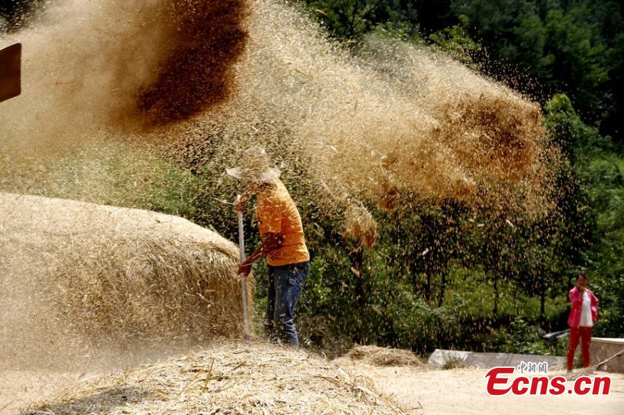Farmers harvest wheat using traditional ways in Qingshui county, Northwest China’s Gansu province. In the mountainous region, farmers cannot use harvesting equipment due to the poor traffic infrastructure and have to harvest wheat manually. (Photo: China News Service/Lei Jinfeng)