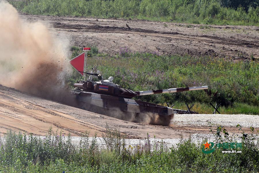 | The individual race of the "Tank biathlon" contest kicked off on Aug. 3 at the Alabino training range in Moscow Region, which was held in the course of the Russian International Army Games 2015. The type 96A tanks of the Chinese People's Liberation Army team participated in the race. (Photo/www.81.cn) |