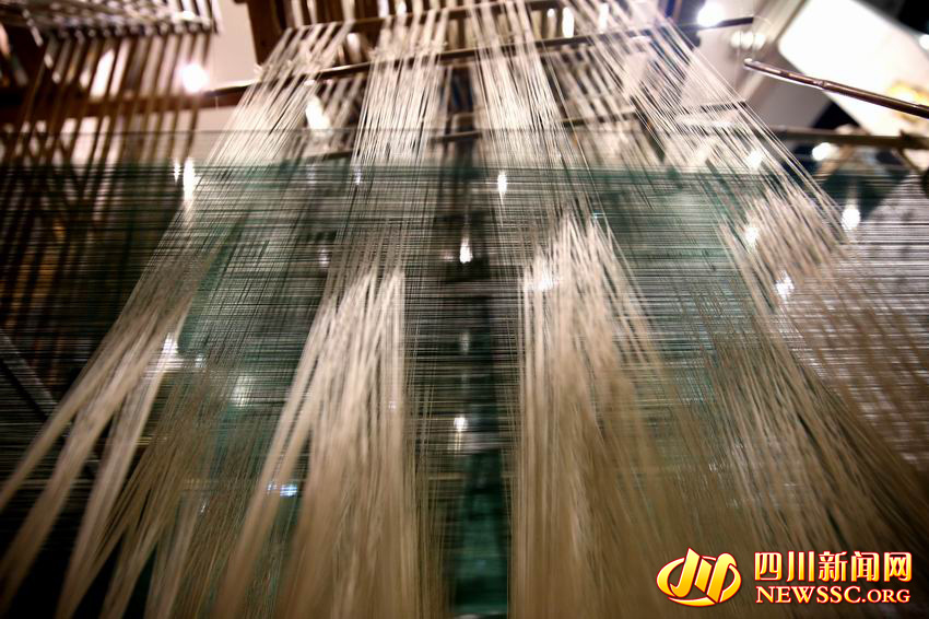 Inheritors of Sichuan brocade handcraft show visitors the whole process of making the brocade on the traditional weaving machine in Sichuan Brocade Museum on Aug. 3, 2015. One of the weaving machines they use is passed down from Qing Dynasty (1636-1912). (Photo/NEWSSC.ORG)