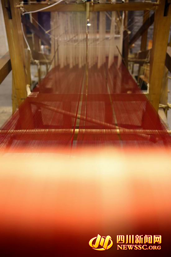 Inheritors of Sichuan brocade handcraft show visitors the whole process of making the brocade on the traditional weaving machine in Sichuan Brocade Museum on Aug. 3, 2015. One of the weaving machines they use is passed down from Qing Dynasty (1636-1912). (Photo/NEWSSC.ORG)