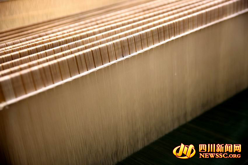 | Inheritors of Sichuan brocade handcraft show visitors the whole process of making the brocade on the traditional weaving machine in Sichuan Brocade Museum on Aug. 3, 2015. One of the weaving machines they use is passed down from Qing Dynasty (1636-1912). (Photo/NEWSSC.ORG) |