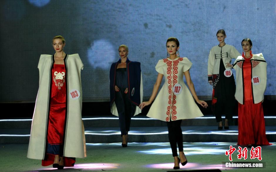 Models show beautiful costumes of the Yi nationality on T stage. (Photo by China News Agency/ Liu Zhongjun)