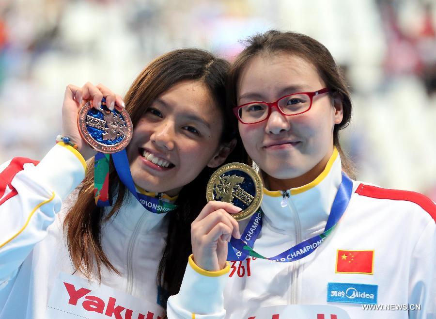 Fu Yuanhui(R) and Liu Xiang of China display their medals after the awarding ceremony of the women's 50m backstroke final at the 2015 FINA World Championships in Kazan, Russia, Aug. 6, 2015. Fu Yuanhui claimed the title with 27.11 seconds and Liu Xiang took the bronze with 27.58 seconds. (Xinhua/Meng Yongmin)