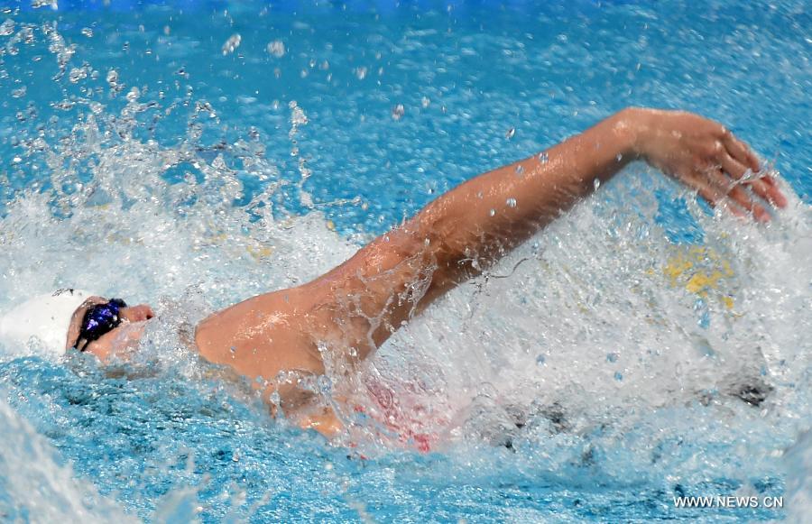 Gold medalist Fu Yuanhui of China competes during women's 50m backstroke final at the 2015 FINA World Championships in Kazan, Russia, Aug. 6, 2015. (Xinhua/Pavel Bednyakov)