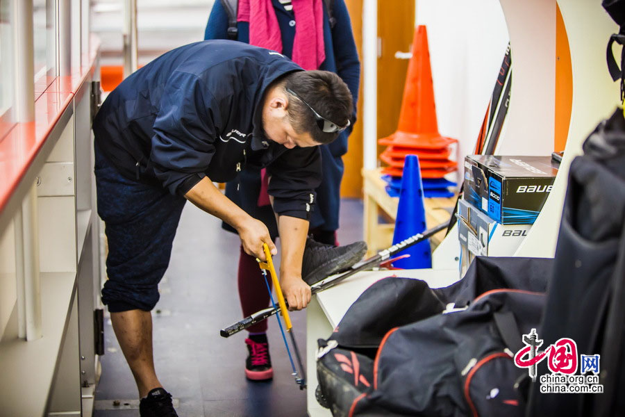 The coach of Huzai Hockey Club does maintenance and repair of the little players' equipment. (China.com.cn/Zheng Liang)