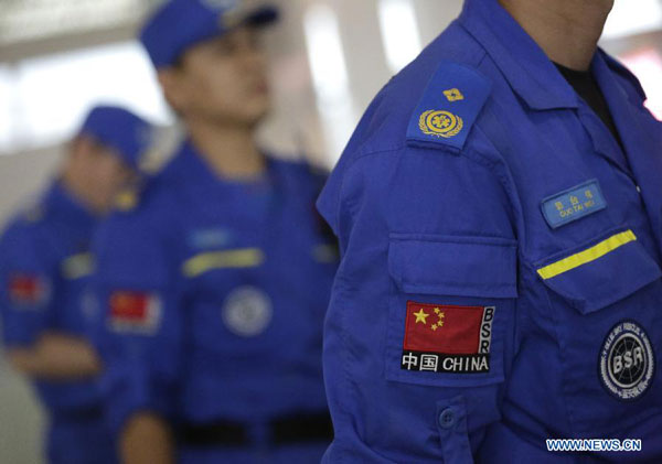 | Members of the Blue Sky Rescue (BSR) Team, a non-governmental humanitarian organization, arrive at Yangon International Airport in Yangon, Myanmar, Aug. 4, 2015. A ten-member Chinese rescue team arrived in Yangon by plane Tuesday to extend helping hand to Myanmar people affected by severe flood which has killed at least 47 people. (Xinhua/U Aung) |