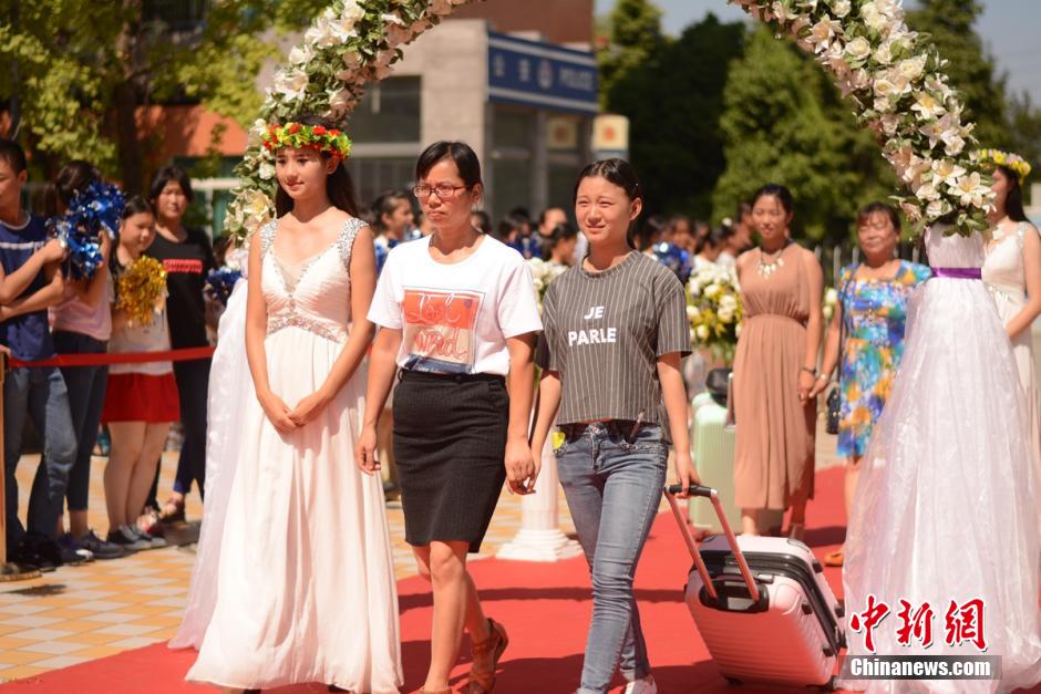 A red carpet ceremony is held in a college in Chengdu, southwest China's Sichuan province to welcome the freshmen on Aug. 5 to 6. "To hold such a ceremony is to give the college freshmen confidence and encouragement. We hope they will treasure the university life," said the president of the college. (CNS/Zhong Xin)