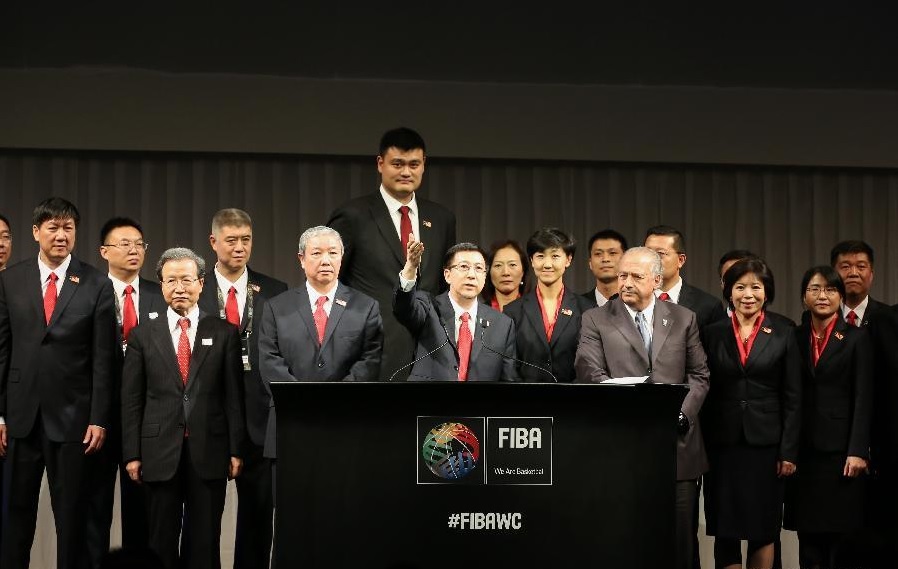 Zhang Jiandong (front C), vice mayor of Beijing and chairman of China 2019 bid committee, speaks after FIBA (International Basketball Federation) president Horacio Muratore announced China as the host country of the 2019 FIBA Basketball World Cup during a ceremony in Tokyo, capital of Japan, Aug. 7, 2015. Chief of FIBA announced here Friday that China will host the 2019 FIBA Basketball World Cup.