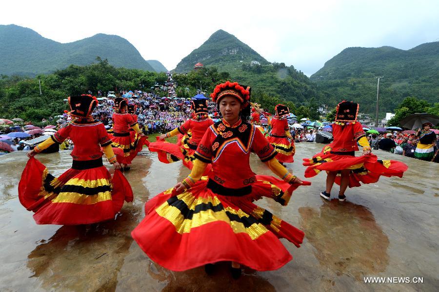 People of Yi ethnic group dance to celebrate the Torch Festival at De'e Township of Longlin Autonomous Prefecture in Baise City, south China's Guangxi Zhuang Autonomous Region, Aug. 8, 2015. (Xinhua/Wei Wanzhong)
