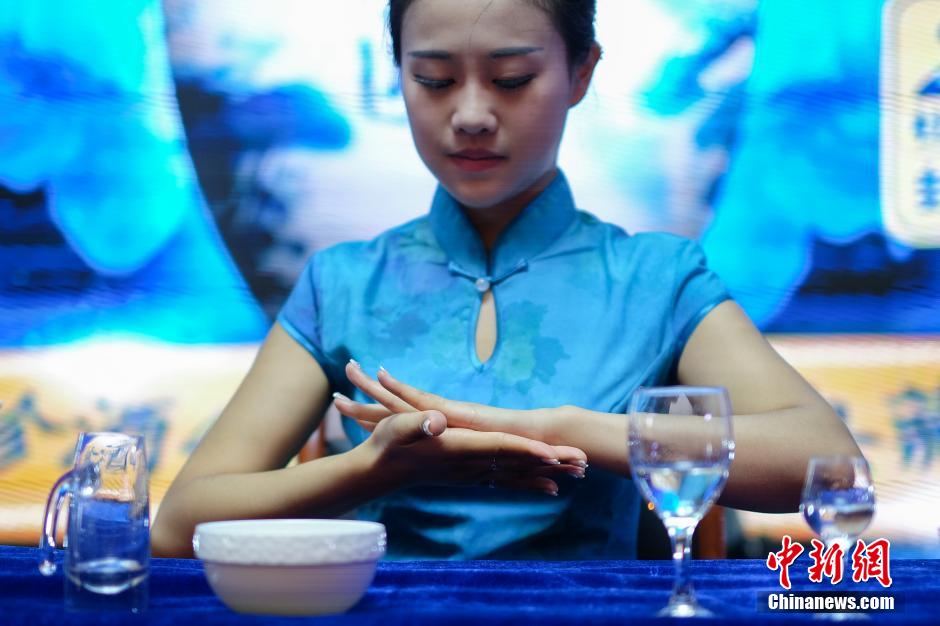 A beautiful female wine taster displayed how to taste Chinese spirits during an event in Zunyi, Guizhou on Aug. 8, 2015. The event attracted a lot of attentions from local citizens.
