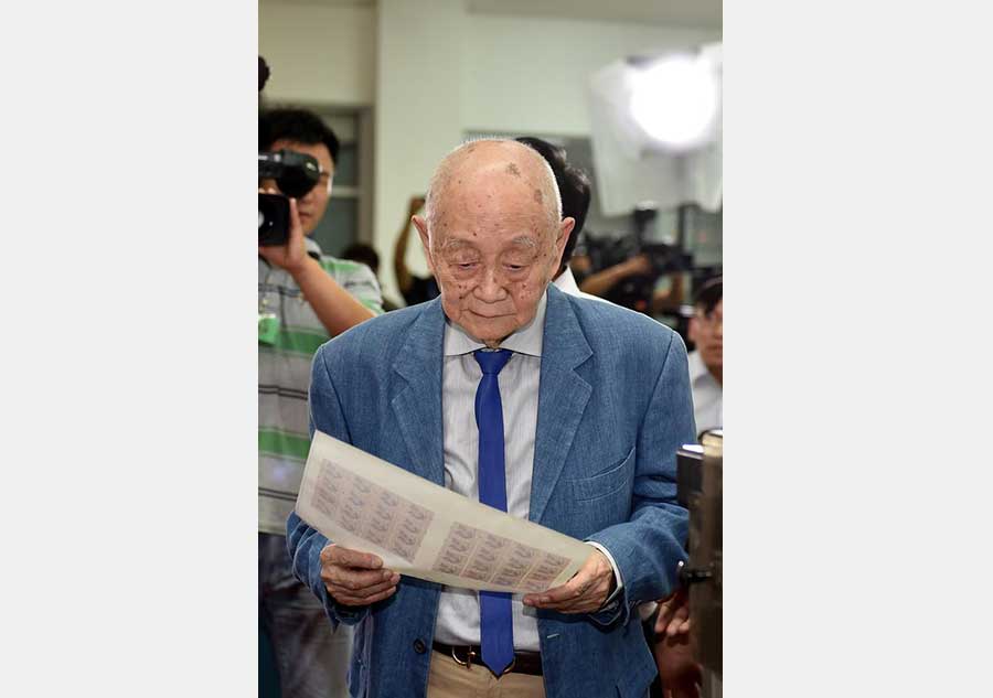 Designer Huang Yongyu examines the special stamps for the Year of Monkey in Beijing, capital of China, Aug 6, 2015. This year's stamps for the monkey was designed by Huang Yongyu, one of the most celebrated cultural icons in contemporary China. The printing of the stamps marked the beginning of the fourth round of the zodiac animal-themed stamps, which have been released in China for 36 years.[Photo/Xinhua]