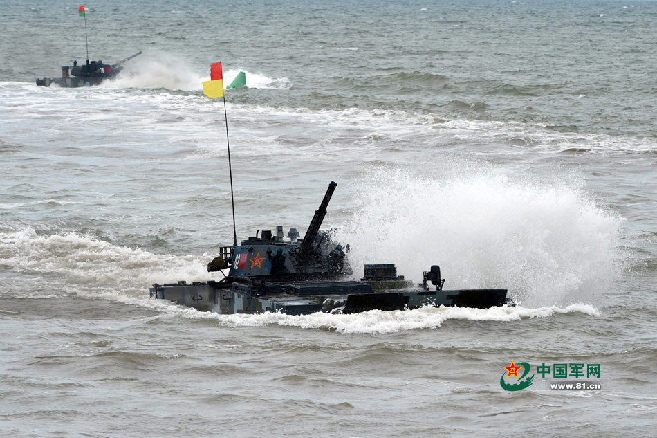 Chinese Marine Corps wins the infantry fighting vehicle racing on the beach of Kaspiysk in the 2015 Russian International Games Competition on Aug. 7, 2015. (Photo/www.81.cn)