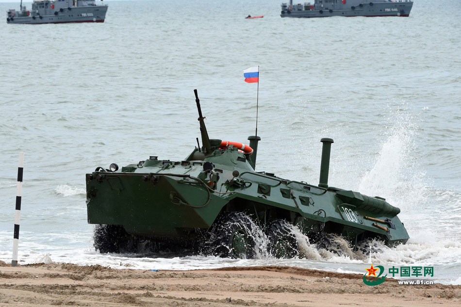 Chinese Marine Corps wins the infantry fighting vehicle racing on the beach of Kaspiysk in the 2015 Russian International Games Competition on Aug. 7, 2015. (Photo/www.81.cn)
