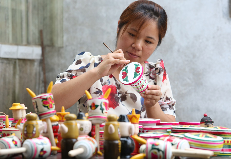 Yang Lan, a villager of Tancheng county, makes wooden toys on Aug. 9, 2015. (Photo/Xinhua)