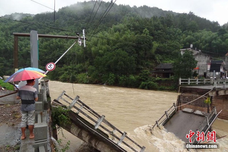 Typhoon Soudelor, the 13th this year, has left 14 people dead in the eastern Chinese cities of Wenzhou and Lishui, where heavy rains triggered mudslides and caused a bridge to collapse. (CNS/ Lin Yichi)